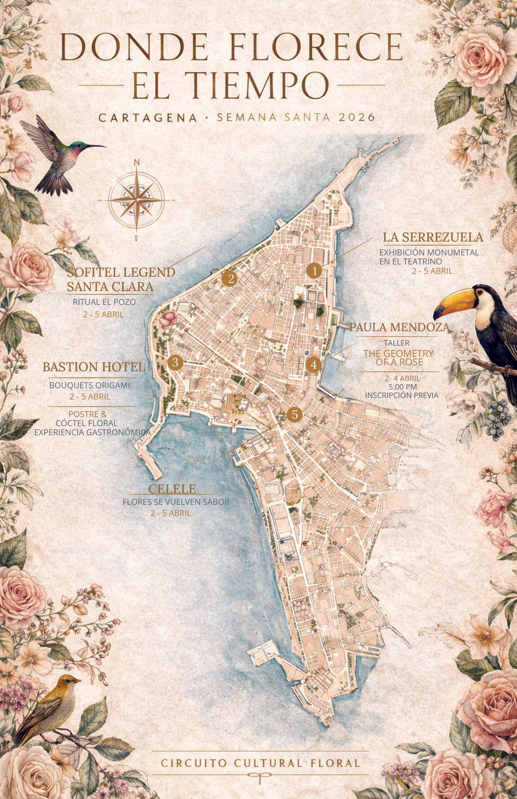 Donde Florece el Tiempo es una intervención cultural monumental que transforma el patrimonio histórico de Cartagena en un circuito sensorial de flores, arquitectura y memoria durante Semana Santa 2026.
